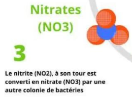 Les nitrites sont transformés en nitrates par une autre colonie de bactérie. Les nitrates sont moins dangereux pour les poissons, car il les tolère beaucoup plus c’est à dire 50 mg/litres.